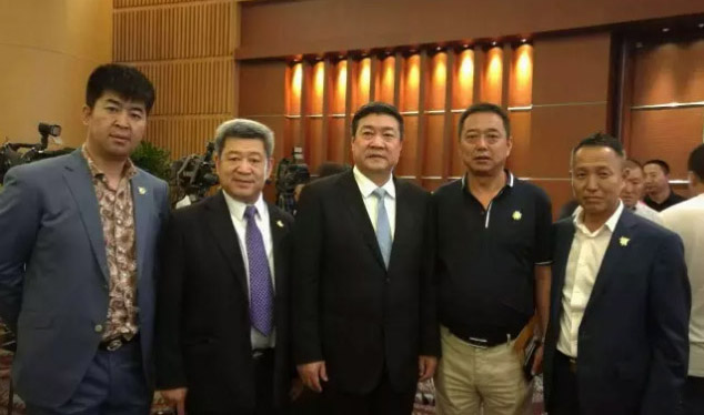(前排左四為內(nèi)蒙古自治區(qū)主席布小林、左五為香港特首梁振英、左六為香港內(nèi)蒙古工商聯(lián)合總會會長陳建文)